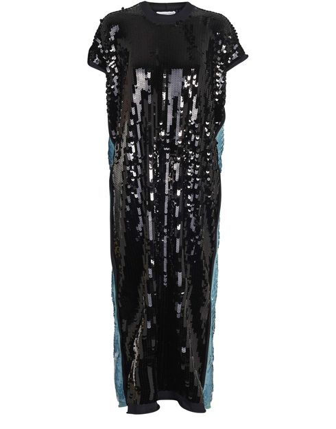 • Description : Robe midi, col rond, couleurs contrastantes, manches courtes, sequins brodés sur toute la surface, coupe fluide.