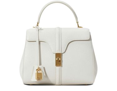 Le sac 16 petit modèle en veau grainé imaginé par Hedi Slimane pour Celine séduit par son design racé. Lignes épurées et détails dorés comme le fermoir et le cadenas estampillé du nom de la maison.