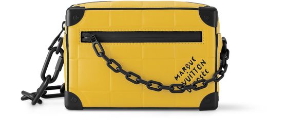 Revisité par Pharrell Williams en cuir de veau Damier Scuba jaune, ce sac Mini Soft Trunk évoque l'équipement des pêcheurs et des plongeurs. Embossée du motif Damier, la matière est doublée d'une couche de néoprène pour reproduire l'aspect matelassé d'un tissu traditionnellement réservé au monde nautique.