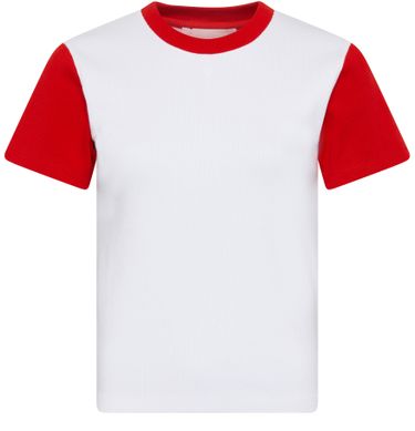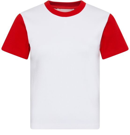 • Description : T-shirt manches courtes, col rond, bords-côtes, revers apparents, coupe ajustée.
