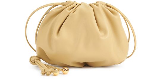 Le Bottega Veneta Sac Mini Bulb est un mini sac à bandoulière en cuir Nappa avec une base plissée pour créer une silhouette arrondie. Il dispose d'un compartiment principal avec une fermeture à cordons et d'une bride nouée agrémentée de pampilles et de 4 sphères en métal. L'intérieur est en cuir de veau léger.