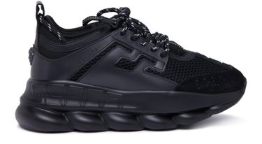 Emblématiques des collections Versace, les baskets Chain Reaction arborent une semelle oversize en forme de chaîne, rehaussée du motif Greca en relief que l'on retrouve sur une découpe latérale.