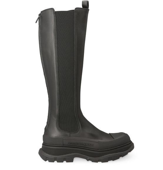 La botte Alexander McQueen présente un bout rond et un logo embossé. Sa tige haute est dotée de côtés élastiqués et d'un passant pour un enfilage facile, ainsi qu'un zip à l'arrière. Sa semelle est épaisse et crantée pour une allure tendance et rebelle.