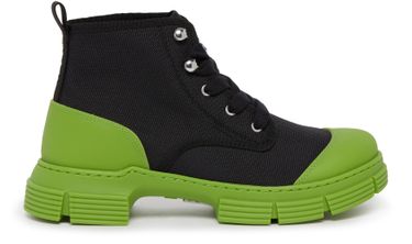 Les bottines Chelsea City de Ganni sont des chaussures à lacets bi-matière avec un bout rond et un logo à l'arrière. Elles possèdent un passant à l'arrière pour un enfilage facile, des finitions métalliques argentées et une semelle épaisse et crantée.