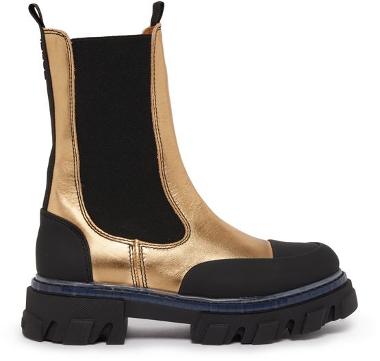Les bottines Chelsea Mid de Ganni sont fabriquées en cuir métallisé avec une tige haute et des coutures apparentes. Elles sont dotées d'une semelle épaisse et crantée pour un look moderne et audacieux. Parfaites pour ajouter une touche de style à n'importe quelle tenue.