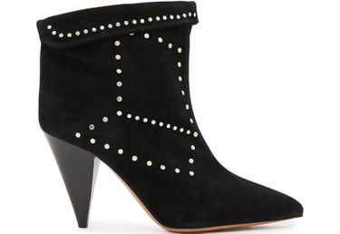 Avec ces bottines Lisbo à talons, Isabel Marant offre une relecture des années 80, qu'elle pimente de sa signature bohème. Les petits clous argentés éclairent le velours de veau noir et rehaussent le modèle d'une note rock et urbaine. On révèle ces bottines avec une jupe trapèze, un top imprimé et un blouson en cuir.