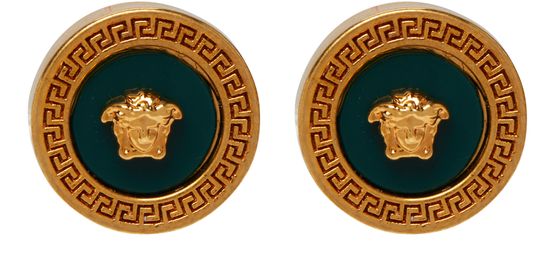 Clous d'oreilles masculins représentant l'emblématique Médusa sur fond sombre entourée du motif Greca, ces bijoux arrondis au design raffiné ont été imaginés par la maison Versace.