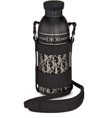 Description : Porte-bouteille à bandoulière en cuir de veau grainé noir, signature "DIOR" en laiton finition ruthénium, bouteille en acier inoxydable à motif Dior Oblique et signature ", signature "DIOR" embossée à l'intérieur, bandoulière amovible et réglable en jacquard de nylon "CHRISTIAN .