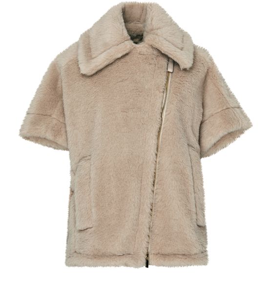 • Description : Manche cape, col cranté, fermeture à glissière, poches latérales passepoilées, matière chaude, coupe asymétrique, détails fourrure.