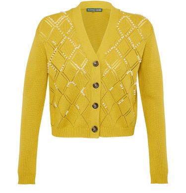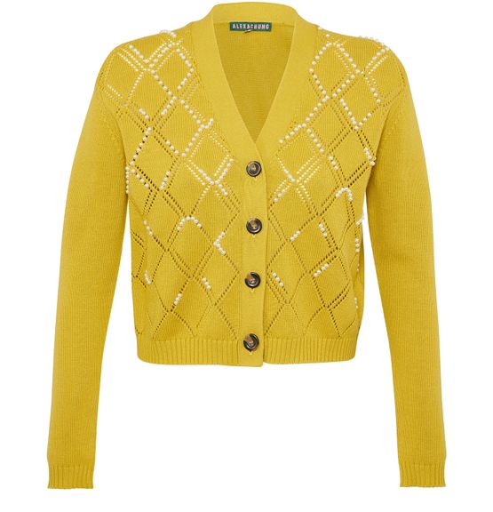 La marque Alexa Chung imagine une pièce très féminine avec ce cardigan court fermé par quatre boutons et ponctué de perles dessinant son motif ajouré.