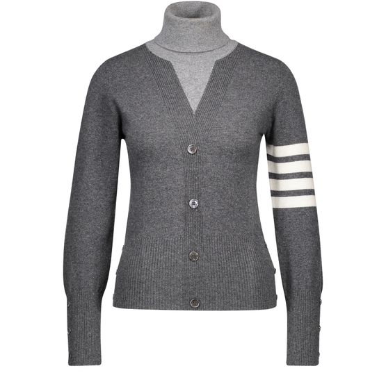 Ce superbe cardigan de chez Thom Browne, entièrement conçu en cachemire, est à la fois sobre et de style casual par ses quatre bandes blanches imprimés.
