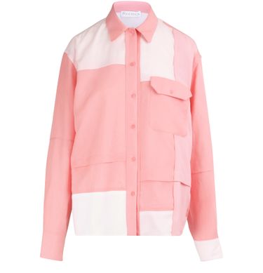 JW Anderson propose des pièces sophistiquées, détaillées et design, mais faciles à porter, comme cette chemise à empiècements. La coupe droite, inspirée de la chemise d'homme ou du vêtement de travail, est associée à une matière moderne et un coloris pop. Asymétrique et oversized, cette veste peut être portée avec un pantalon ample de la collection ou avec un mini-short et des boots à talons.