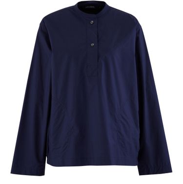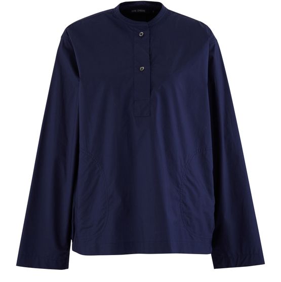 Sofie d'Hoore propose ici sa chemise dos plissé en popeline de coton noir. Le col Mao ouvre sur deux boutons qui lui confèrent un air décontracté.