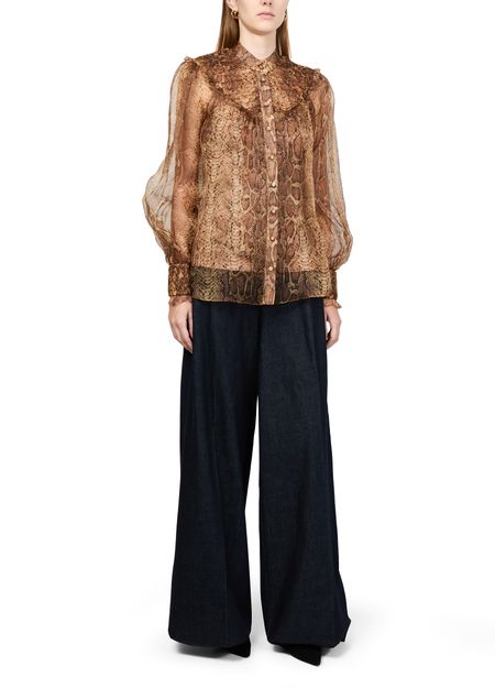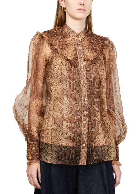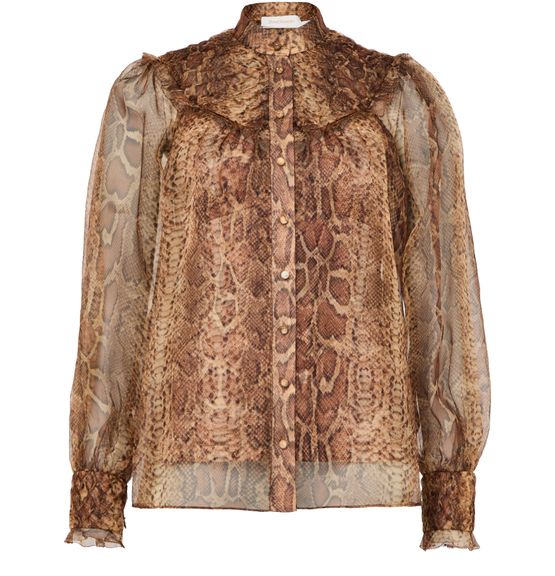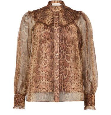 Découvrez la blouse motif python de Zimmermann, pièce maîtresse avec une encolure montante et des manches longues bouffantes. La fermeture à bouton ajoute une touche d'élégance, tandis que la doublure transparente amplifie son charme raffiné. Idéal pour des sorties décontractées ou des événements formels, ce chemisier s'associe parfaitement à toutes les tenues.