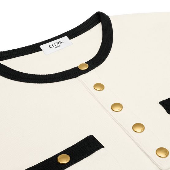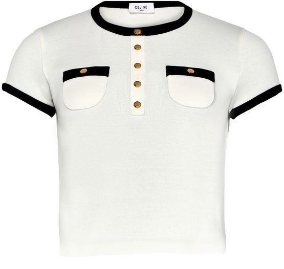 Découvrez le cropped t-shirt en jersey de coton de Celine, une pièce incontournable pour les amateurs de coupe classique. Il se distingue par une longueur raccourcie, un col ras du cou élégant, et deux poches plaquées sur la poitrine avec des rivets gravés Celine Paris. Les finitions en bord-côte contrasté complètent ce modèle.