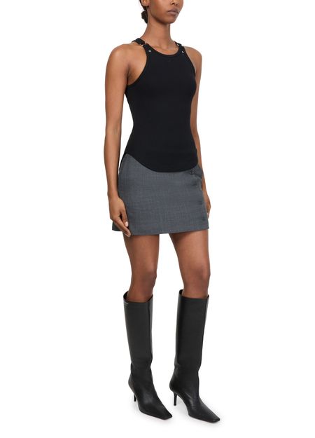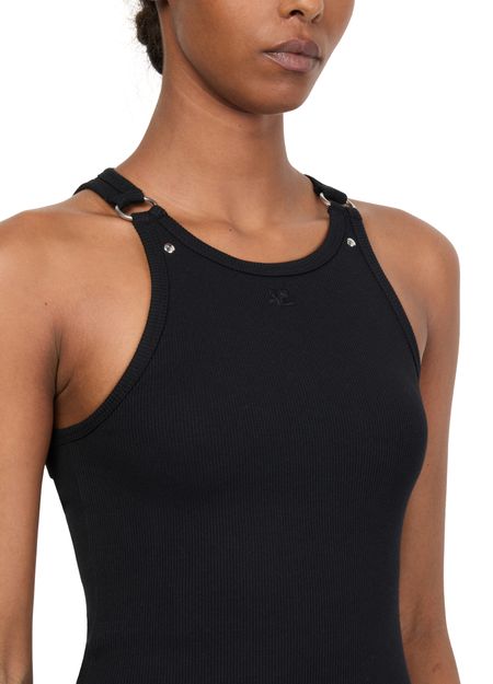 Découvrez le débardeur à bords-côtes 90's avec boucle de courreges, alliant style et confort. Ce modèle à coupe ajustée, avec une encolure ras du cou et une texture côtelée, offre une silhouette flatteuse. Parfait superposé ou seul, il est indispensable pour toute garde-robe.
