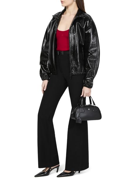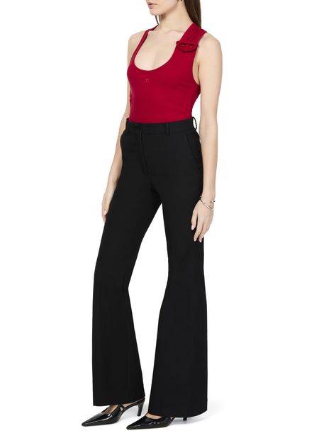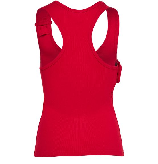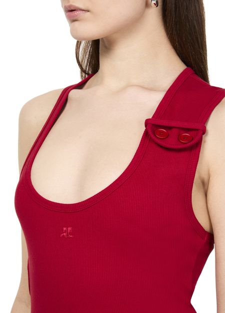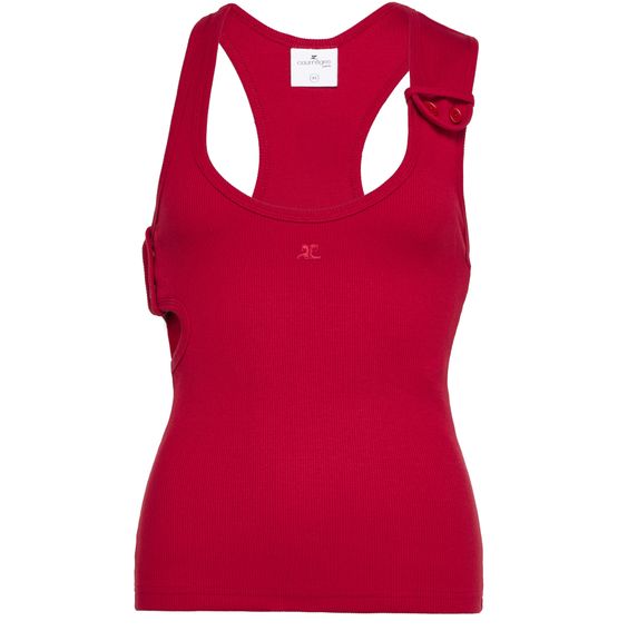Le débardeur à bords-côtes croisé double des années 90 de Courrèges incarne l'élégance classique. Sa coupe asymétrique et son col rond mettent en valeur le logo brodé sur la poitrine. Avec une fermeture à bouton et une surpiqûre visible, ce modèle sans manches allie confort et style intemporel pour une allure chic.