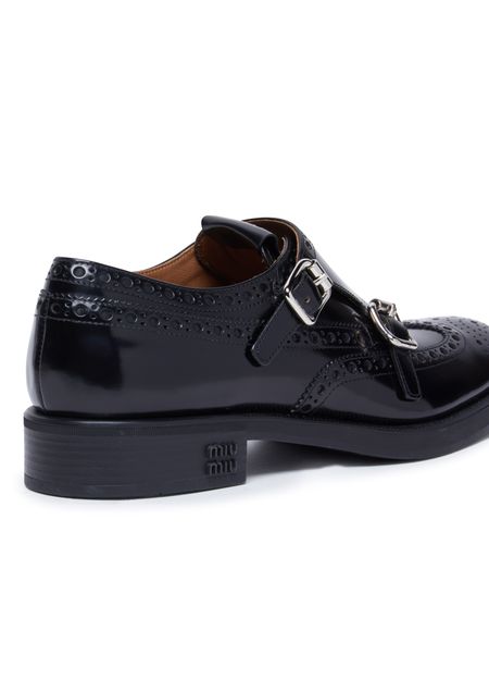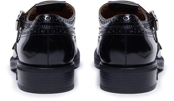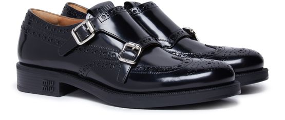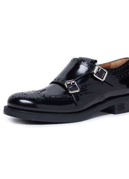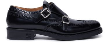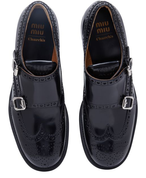 Les Richelieus à boucles Miu Miu x Church allient élégance et modernité avec leur semelle extérieure épaisse et leur talon carré. Le logo métallique à l'avant ajoute une touche de sophistication, tandis que les détails contrastants en cuir lisse apportent une dimension supplémentaire à ces chaussures impeccables.