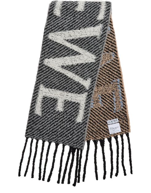 Découvrez l'écharpe Loewe en laine et alpaga, ornée d'un imprimé rayures saisissant. Les bords effrangés ajoutent une touche de style, tandis que l'imprimé logo le long de la bordure assure une finition signature. Idéale pour sublimer toute tenue avec son élégance moderne.