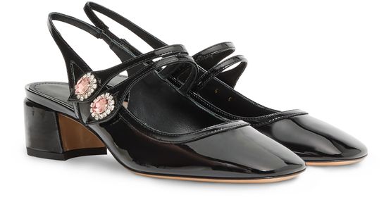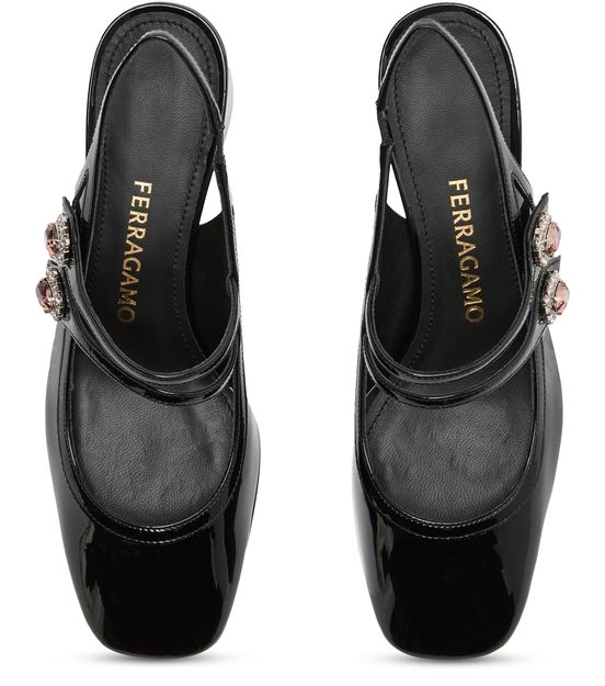 Découvrez les escarpins à bride Mary Jane Salvatore Ferragamo, dotés d’un bout carré fermé et d’une bride à boucles élégante. Le petit talon bloc et la semelle intérieure en cuir offrent confort, tandis que la bride sertie de cristaux et le logo doré subliment la finition argentée.