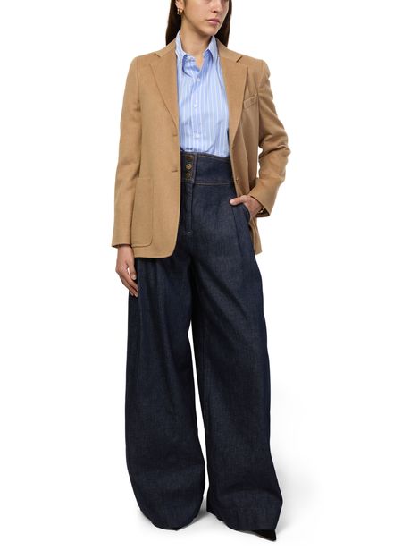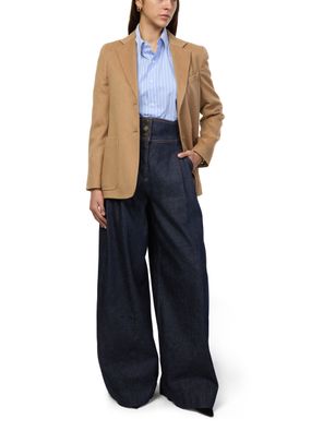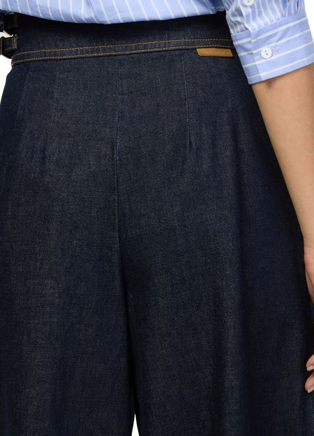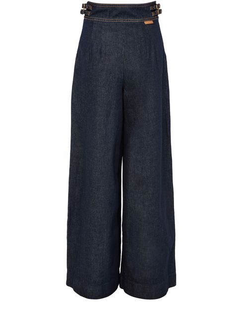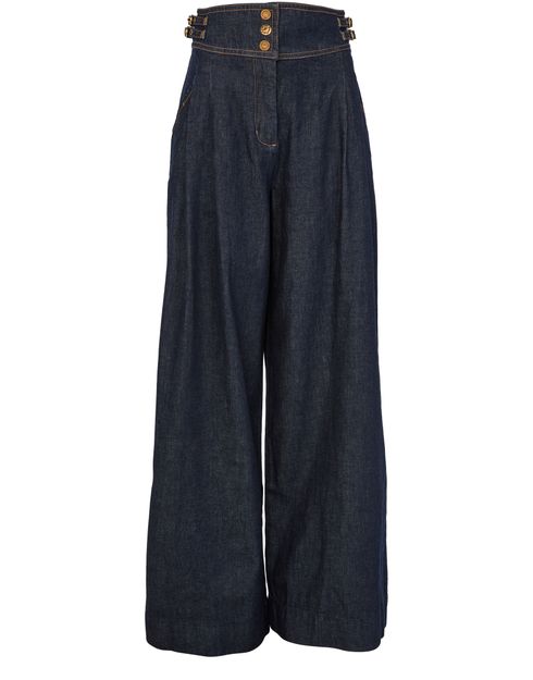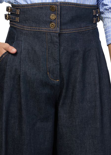 Découvrez le pantalon casual en jean bleu délavé Zimmermann, longueur cheville, orné de pinces à l'avant et de surpiqûres contrastées. Les boutons décorés et les passants pour ceinture apportent une touche raffinée. Idéal pour un look élégant et confortable au quotidien.