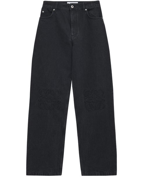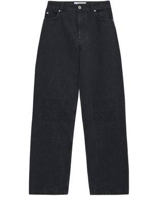 Adoptez le jean baggy Anagram de Loewe, porté taille haute pour un look tendance. Doté de passants pour ceinture et d'une fermeture à glissière avec bouton, il allie confort et style. Le logo brodé à l'avant et la surpiqûre visible accentuent son côté moderne.