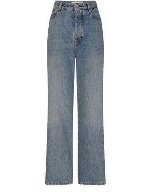 Le jean large Loewe présente un logo appliqué à l'arrière et un détail patch distinctif. Il est doté d'une fermeture bouton et à glissière dissimulée, ainsi que de poches latérales et d'une poche plaquée à l'arrière. Sa longueur cheville lui confère un style moderne et polyvalent, idéal pour toutes les occasions.