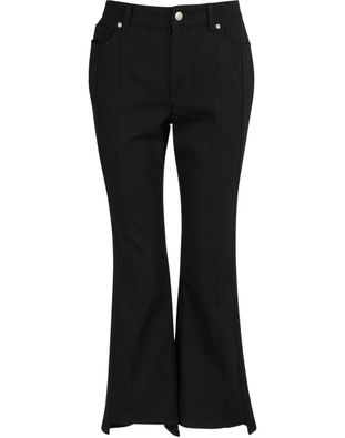 Le classicisme est une hérésie pour la maison Alexander McQueen qui présente ce jean raccourci. La coupe droite, faussement traditionnelle, se termine à la cheville pour former un bas évasé à l’asymétrie provocante. Avec un pull en laine et des bottines baroques, imaginez une tenue hommage au mythique créateur britannique.