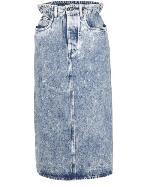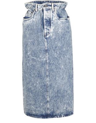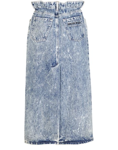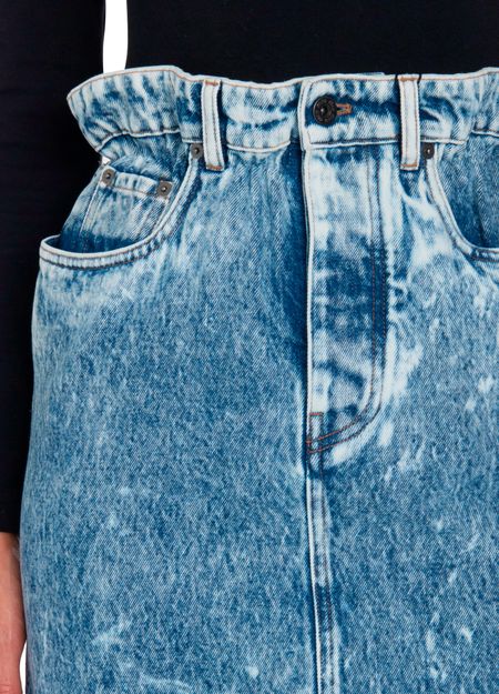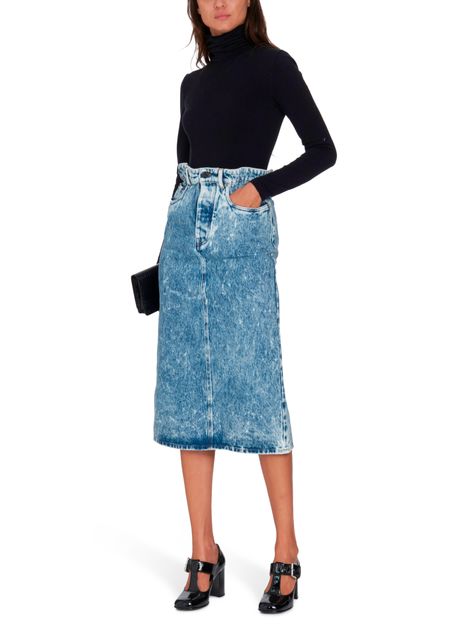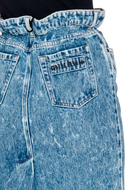 La jupe droite en denim effet délavé de la marque Miu Miu est un modèle mi-long pour femme, avec passants à la ceinture et fente à l’arrière. Elle possède une fermeture à bouton et deux poches à l’avant, ainsi que le logo de la marque cousu sur l’une des deux poches arrière.