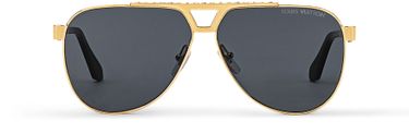• Description : Verres noirs, forme aviateur, charnières souples, branches en métal à extrémités contrastées, pont en V, barre supérieure gravée du motif Monogram, signature Louis Vuitton au laser sur les verres, signature Louis Vuitton gravée sur les branches.