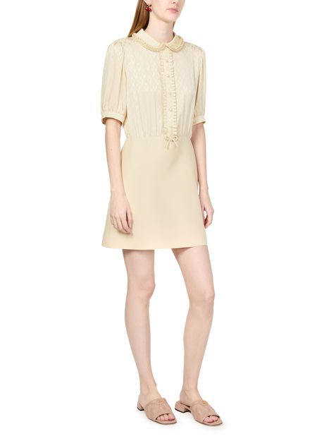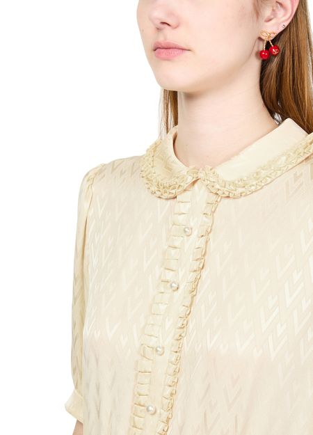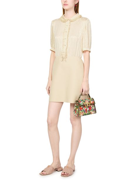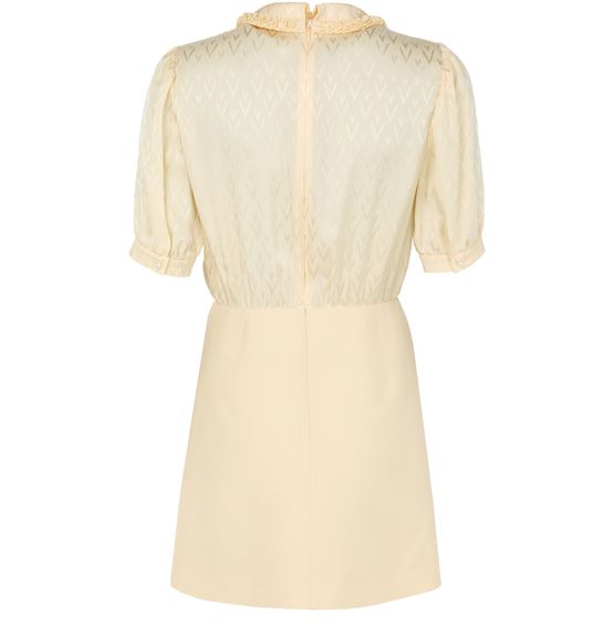 La mini robe couture en crêpe de Valentino arbore un imprimé délicat. Sa coupe trapèze flatte la silhouette, tandis que le col polo et les manches courtes ajoutent une note de fraîcheur. La fermeture à glissière dissimulée au dos et la surpiqûre visible soulignent un savoir-faire raffiné et contemporain.