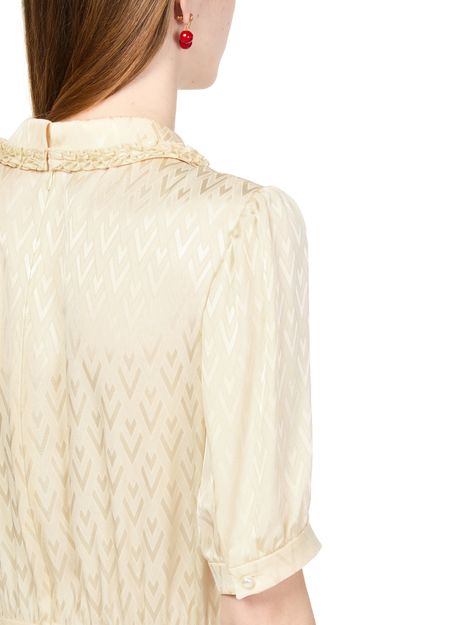 • Description : imprimé, fermeture à glissière dissimulée au dos, surpiqûre visible, col polo, coupe trapèze, manches courtes, mini robe, taille resserrée.