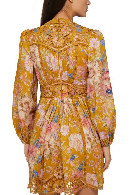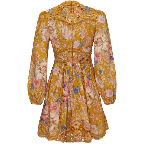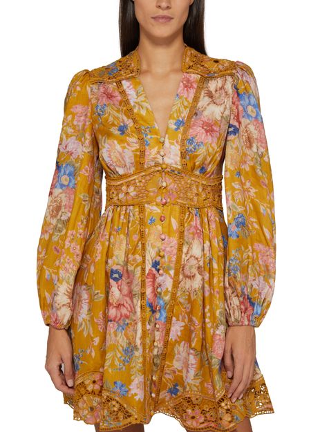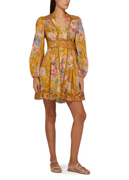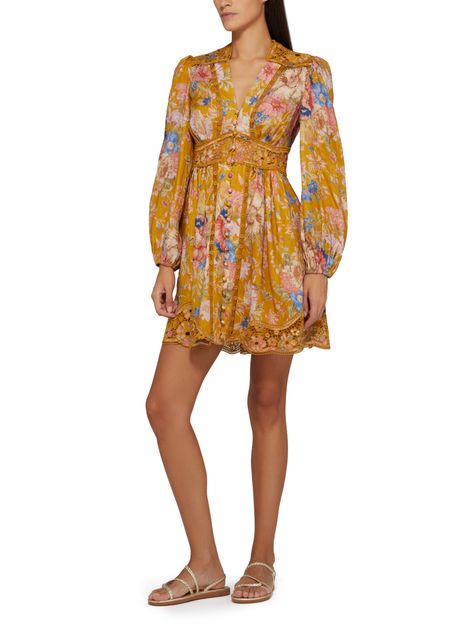 La mini robe décolletée August de Zimmermann est dotée de manches longues et d'un col en v flatteur. Les détails plissés et dentelés ajoutent une touche de féminité à cette tenue élégante. Parfaite pour une soirée spéciale ou une sortie décontractée, cette robe à la coupe flatteuse est un incontournable de la garde-robe.