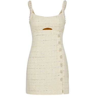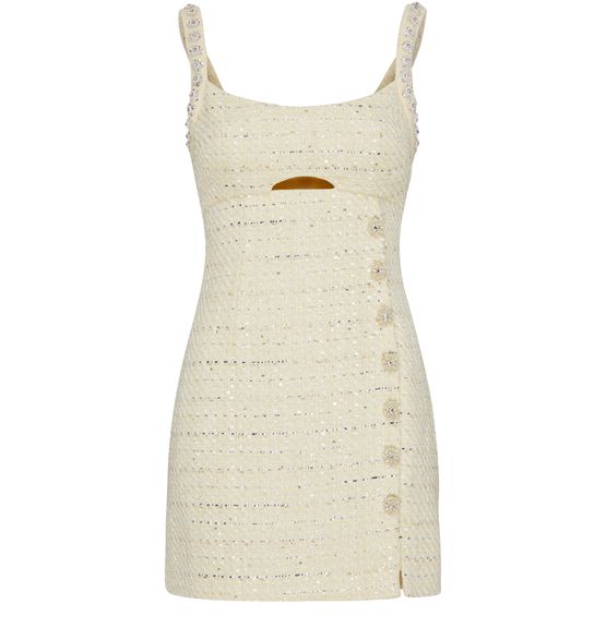 La robe courte Self Portrait, sans manches, révèle un décolleté séduisant et des bretelles délicates. Ses boutons décorés ajoutent une touche raffinée, tandis qu'une fente à l'avant accentue le mouvement. Les découpes graphiques sculptent la silhouette, offrant une allure audacieuse et contemporaine, parfaite pour les occasions spéciales.