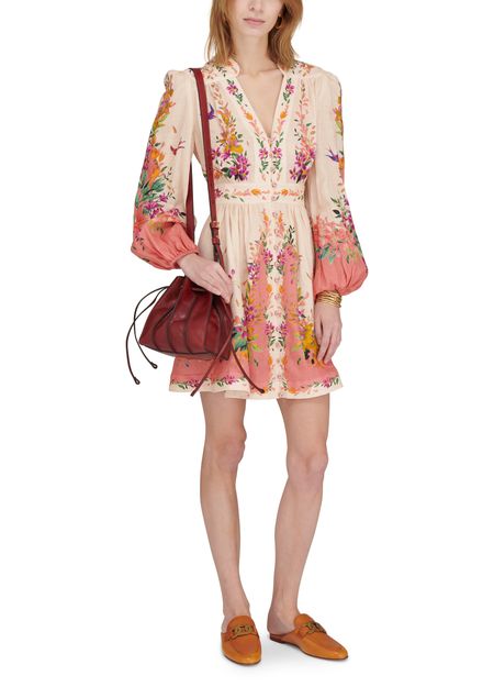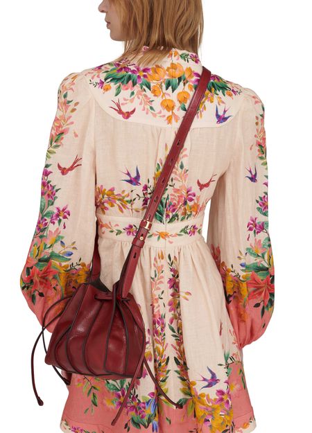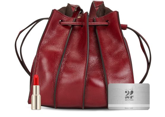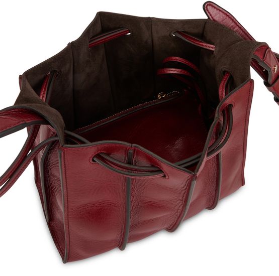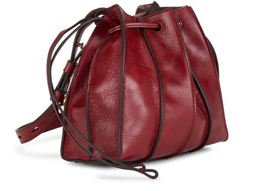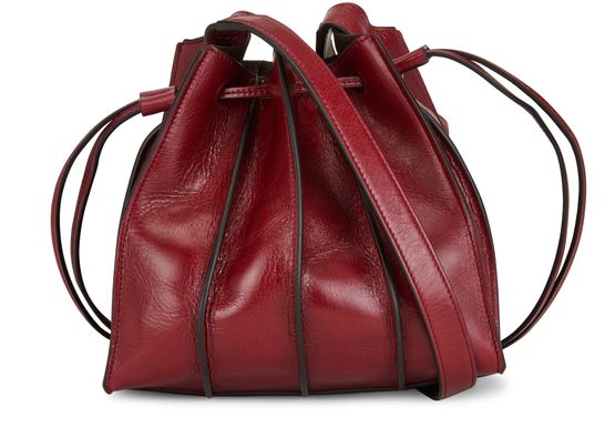 • Description : Textured leather mini bag, adjustable strap, metallic logo, single compartment, antique gold-toned metal finishes, drawstring closure, worn in the hand or on the shoulder.