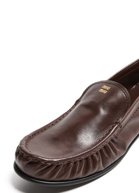 Découvrez les mocassins en cuir lisse de Miu Miu, dotés d’un bout arrondi et d’un talon plat pour une allure contemporaine. La piqûre visible et le logo estampé sur la languette soulignent le style, tandis que la semelle intérieure en cuir offre un confort optimal au quotidien.