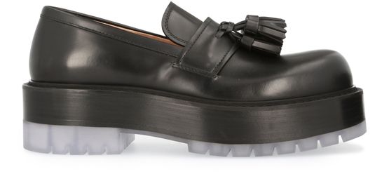 Les mocassins sur semelle haute de Bottega Veneta présentent une forme imposante ponctuée de glands et posée sur une semelle où les crans sont transparents.