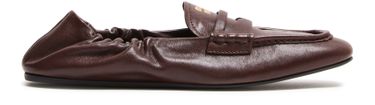 Découvrez les mocassins en cuir de Miu Miu, confectionnés en cuir lisse avec un bout carré fermé. Les côtés élastiqués offrent un confort optimal, tandis que la piqûre visible et le logo sur la languette soulignent l’élégance moderne de ce modèle à talon plat.