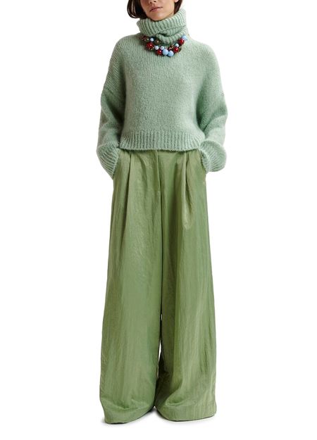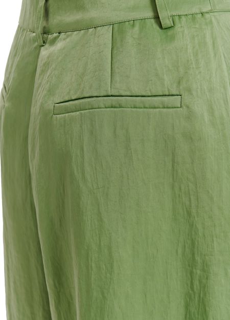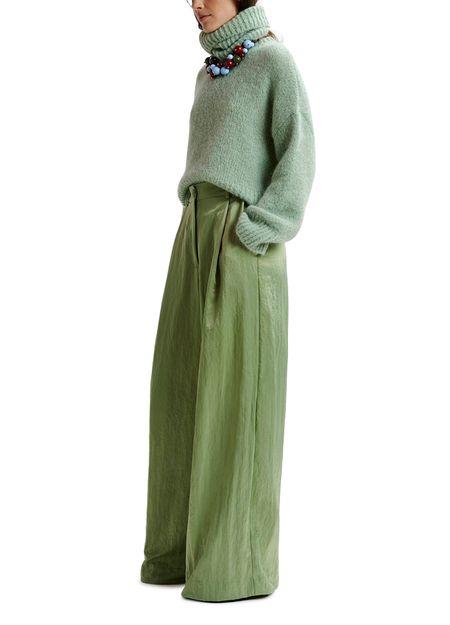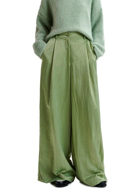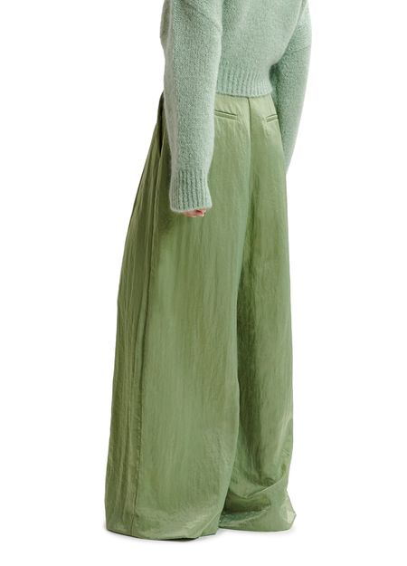 Réalisé dans un satin lustré composé de polyamide recyclé mélangé, ce pantalon présente des plis réfléchis à la taille qui s'évasent en larges jambes fluides. Il est doté de deux poches passepoilées à l'arrière, de poches avant en biais et d'une fermeture zip et bouton.