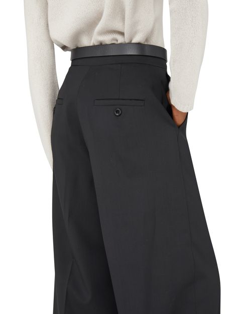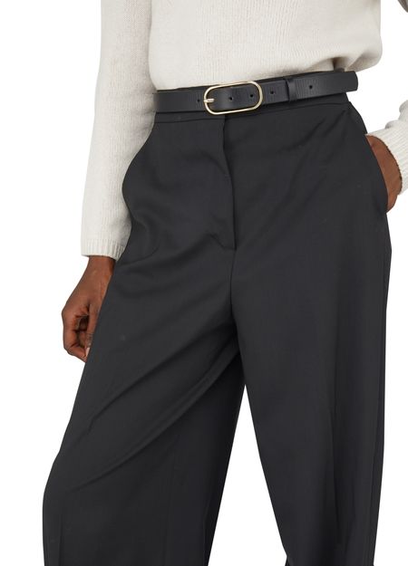 • Description : Pantalon taille haute, coupe droite et large, fermeture dissimulée, détails plis.