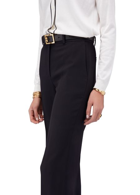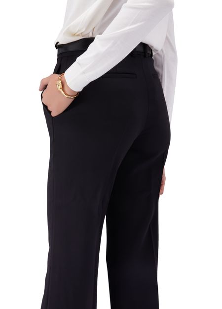 Description : Pantalon évasé, forme ample, pinces à l'avant et au dos, poches latérales, poches arrière passepoilées, passants pour ceinture, fermeture à glissière dissimulée.