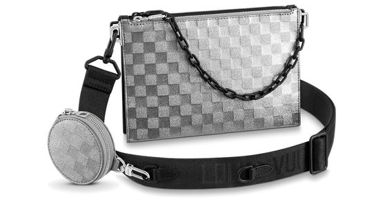 La pochette Trio modulable reflète l'esprit rave party du défilé « Amen Break » de Virgil Abloh pour le Printemps-Été 2022. Cette édition mêlant le cuir Damier Glitter éblouissant au somptueux cuir Taurillon Monogram noir s'agrémente d'une chaîne noire. Deux compartiments principaux, une pochette ronde amovible et une bandoulière en jacquard en font un compagnon idéal à porter en toute occasion.