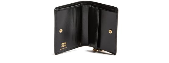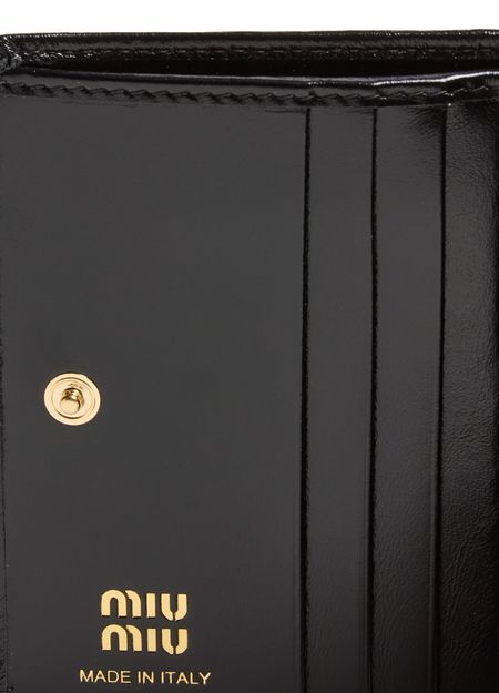 Découvrez le porte-monnaie en cuir avec détails cadenas de Miu Miu, confectionné en cuir lisse et orné du logo Miu Miu en lettres métalliques. Les finitions dorées, les surpiqûres apparentes et le porte-clés amovible offrent une touche sophistiquée et fonctionnelle.