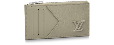 Ce porte-monnaie et porte-cartes décline du cuir de vache Aerogram dans une nouvelle teinte élégante. Ce modèle compact comprend quatre fentes pour les cartes, une poche avec fermeture à glissière pour la monnaie et un compartiment plat pour les billets. Il est signé par les initiales LV en métal ton sur ton, symboles de la collection Aerogram.