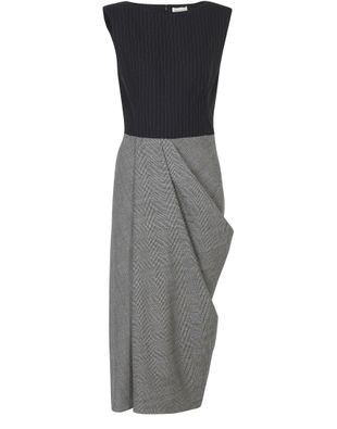 En laine vierge et cachemire, cette robe imaginée par la maison Alexander McQueen donne l'illusion d'une jupe midi drapée, portée sur un haut sans manches.