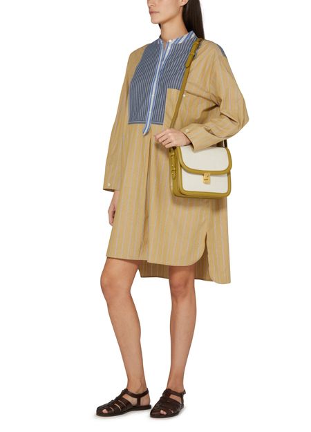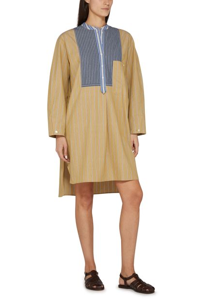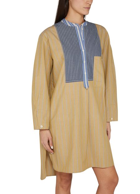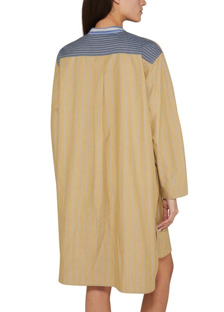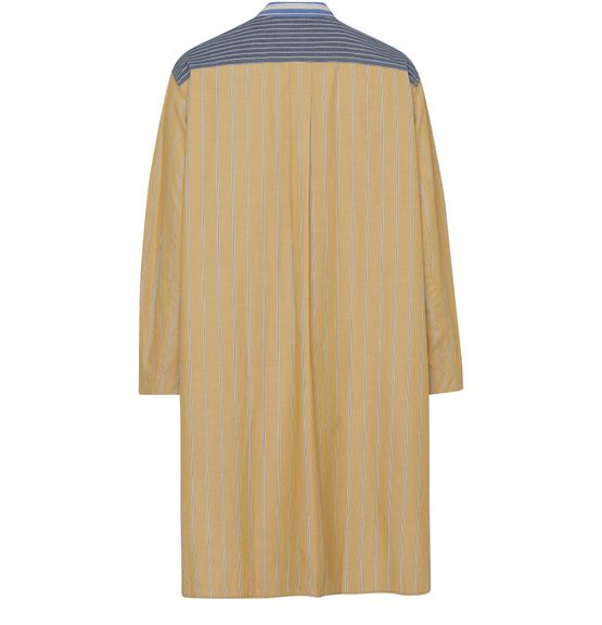 • Description : robe chemise, longueur genou, étiquette avec logo à l’arrière, boutons sur le devant, fermeture à bouton, manches longues, col mao, plus court à l'avant, six boutons à l'avant, imprimé rayures.