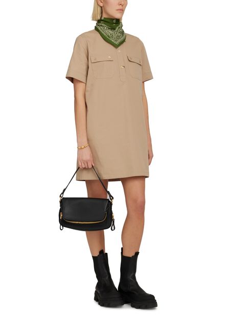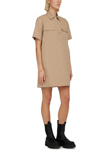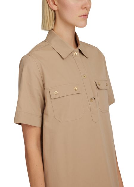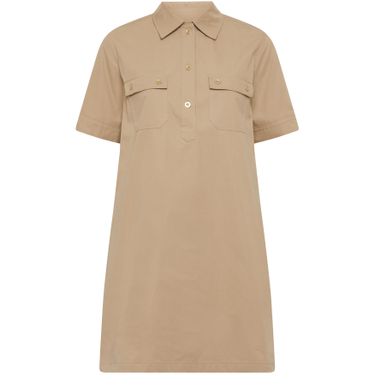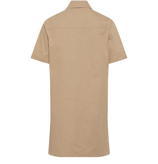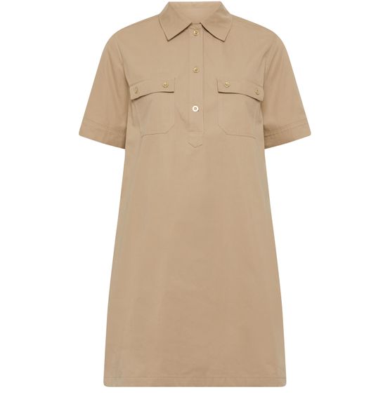 • Description : Robe chemise mi-longue, coupe droite, col classique, manches courtes, poches à rabat, fermeture boutonnée.