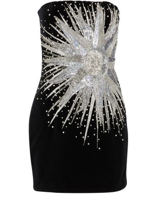 Avec la robe bustier courte, Balmain s’amuse à imaginer la mode du futur. Le designer Olivier Rousteing nous emmène en 2050 avec cette robe du soir qui fait du soleil un nouveau symbole féminin. Les sublimes cristaux minutieusement brodés sont incontestablement la signature unique de la marque parisienne.