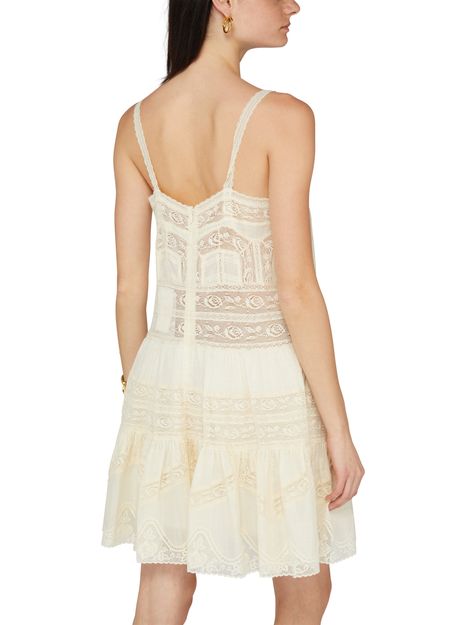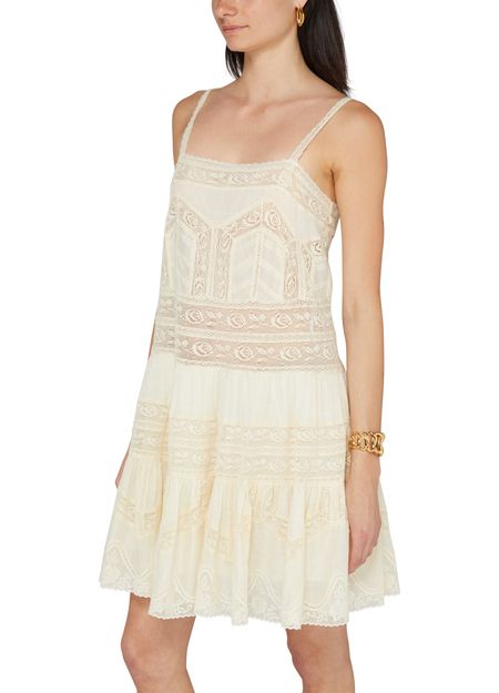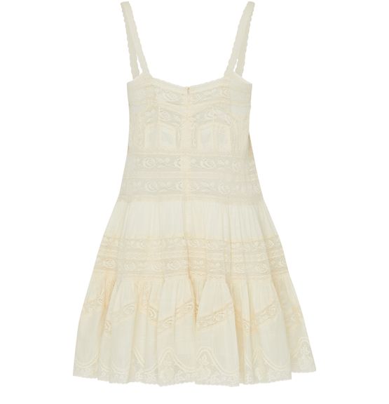 La mini robe courte bordée de dentelle Halliday de Zimmermann séduit par son encolure rectangulaire et ses délicates bretelles. Son imprimé floral évoque un jardin en fleurs, tandis que la fermeture à glissière au dos assure un ajustement parfait. Une pièce incontournable pour une allure romantique et élégante.