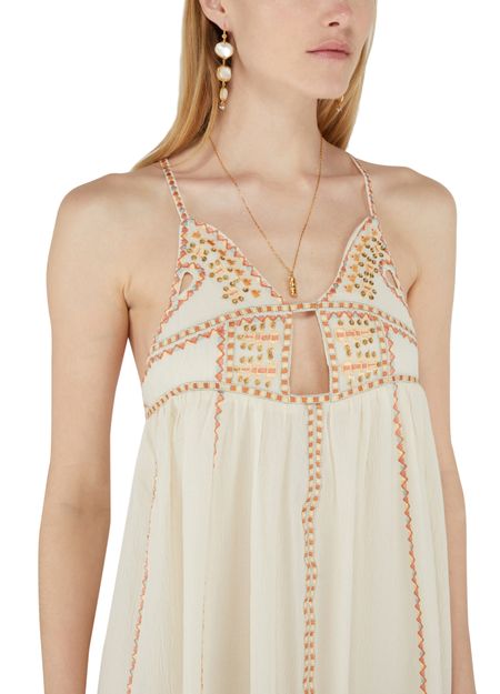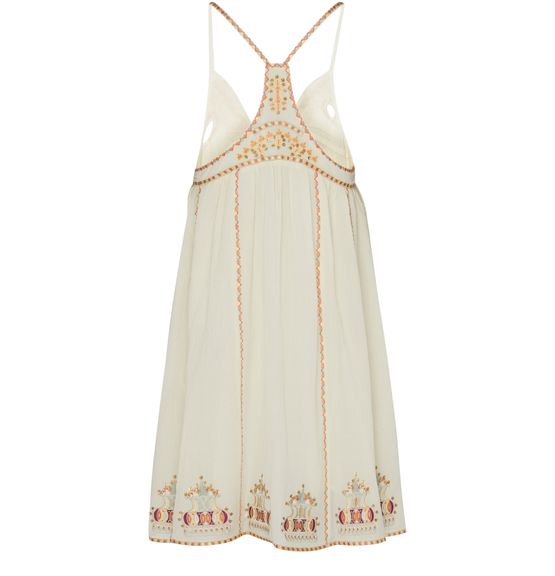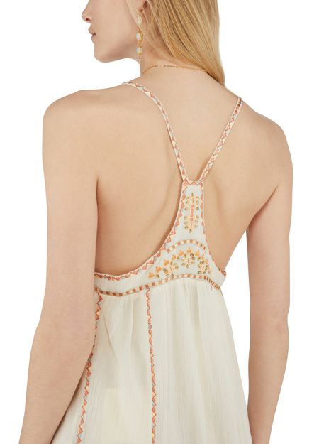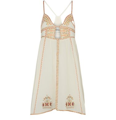 • Description : mini robe, col en v, étiquette avec logo à l’arrière, détails broderie, détails sequins, plus court à l'avant, bretelles fines/spaghetti, bretelles, froncée à la taille.